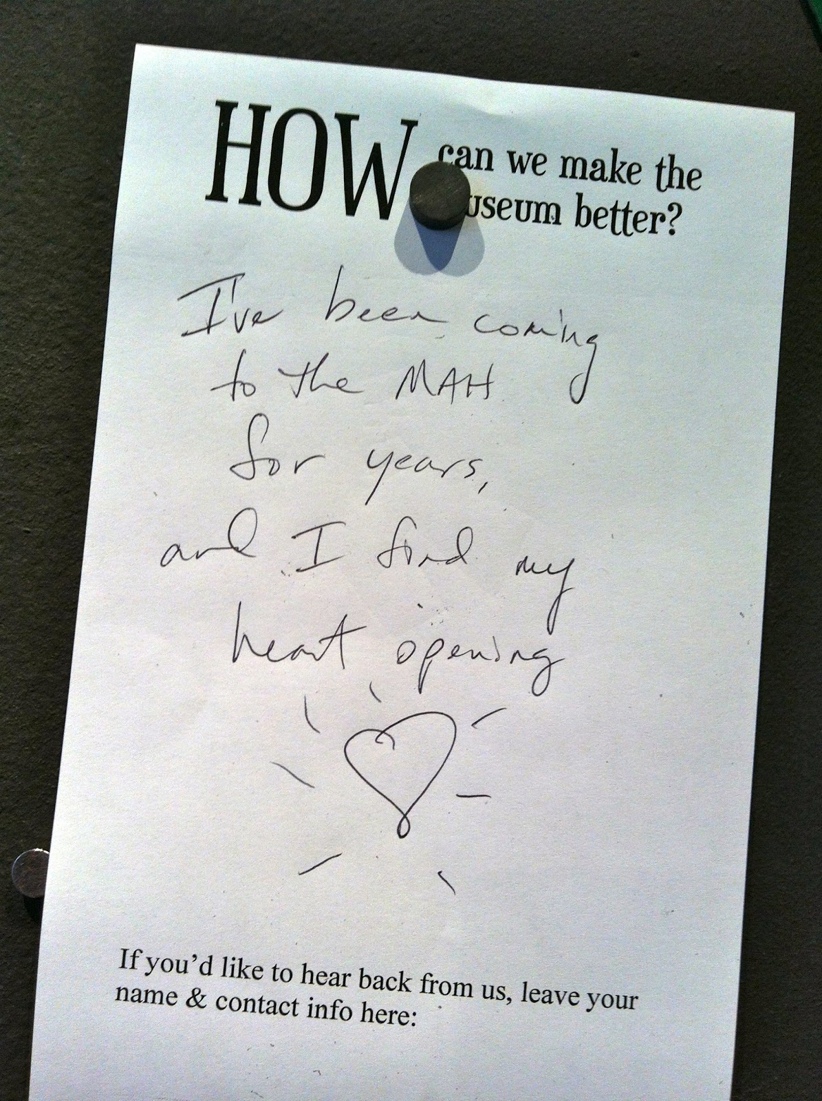 - The speed and extent of the community response. We still have a long way to go to make the MAH the “thriving central gathering place” of our vision statement. But it’s kind of amazing how quickly our role in the eyes of community members changed. Visitors, members, donors, volunteers, and the media have been effusive about what they describe as the “new energy” at the museum. I didn’t imagine that would happen in such a short time frame, and I think it’s going to help all of us—staff, board and community members—continue the conversation about how to keep the energy going.